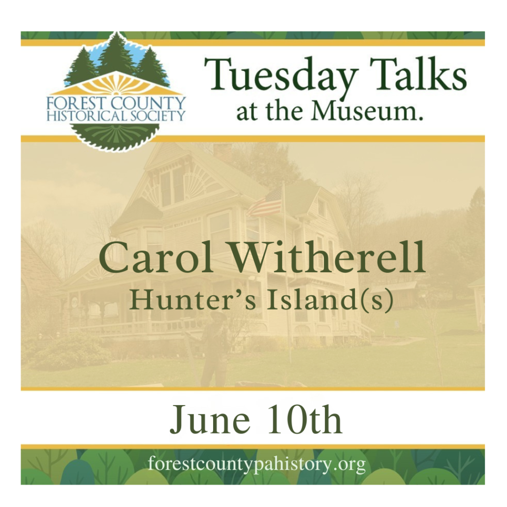 The Forest County Historical Society is excited to welcome Carol Witherell for a fascinating evening focused on the History of Hunter’s Island(s)! Speakers will talk from 7:00-7:30 and then stay around until 8:00 pm for any questions from the audience. This event is free for all museum members and costs $5.00 for non-members and includes a tour of the museum. We hope we have an interesting line-up for you this summer and you will come and join us.