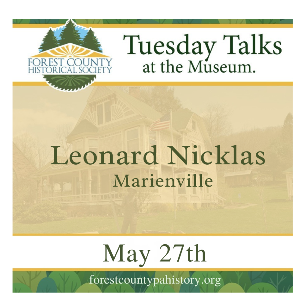 The Forest County Historical Society is excited to welcome Leonard Nicklas for a fascinating evening focused on an item of interest from Marienville’s unique history! Speakers will talk from 7:00-7:30 and then stay around until 8:00 pm for any questions from the audience. This event is free for all museum members and costs $5.00 for non-members and includes a tour of the museum. We hope we have an interesting line-up for you this summer and you will come and join us.