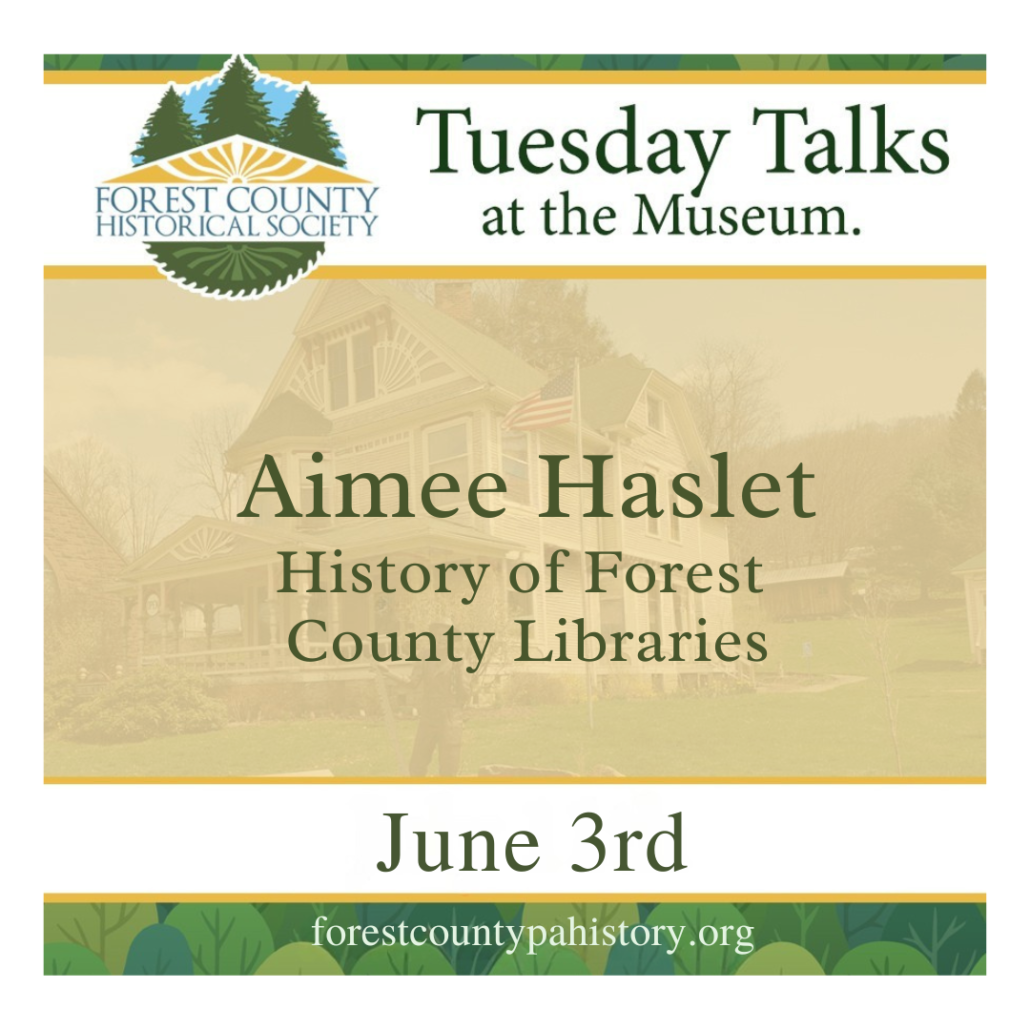 https://forestcountypahistory.org/wp-content/uploads/2019/08/Forest-County-Historical-Society-Logo-156.png00Aimee Haslethttps://forestcountypahistory.org/wp-content/uploads/2019/08/Forest-County-Historical-Society-Logo-156.pngAimee Haslet2025-05-19 11:18:322025-05-26 10:12:46Tuesday Talk June 3rd