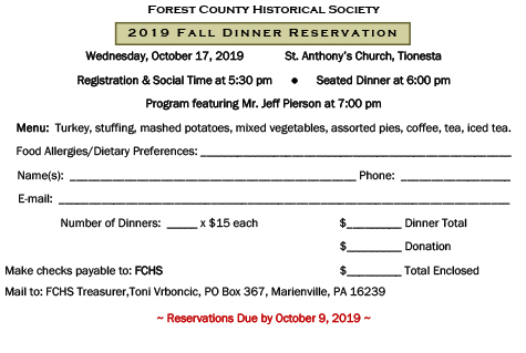 The FCHS annual fall dinner will be held at St Anthony’s Church Hall, 112 Bridge Street in Tionesta, on October 17th with a social time at 5:30 and the meal served at 6:00 pm.