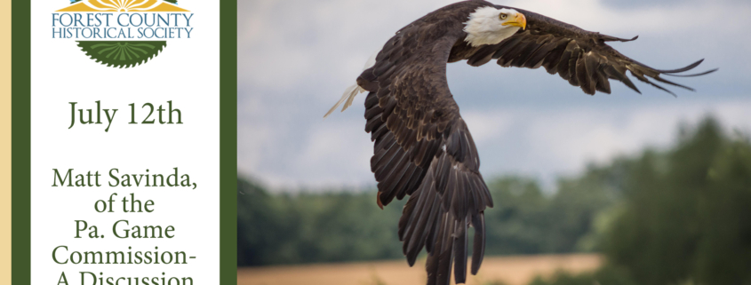 Matt Savinda, of the Pa. Game Commission-will be with us once again and this year he will speak about Eagles. The Forest County Historical Society has set education as a priority in serving our Forest County community. We have finalized our schedule for our Tuesday lecture series called Tuesday Talks at the Museum. These talks all start at 7:00 at the museum. Speakers will talk for half of an hour and then stay around until 8:00 for any questions from the audience. This event is free for all museum members and cost $5.00 for nonmembers. We hope we have an interesting line up for you this summer and you will come and join us.