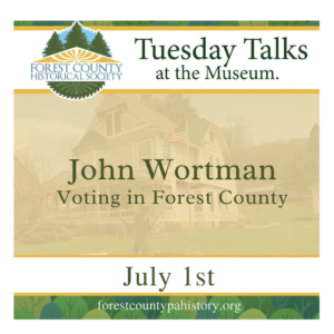 The Forest County Historical Society is excited to welcome John Wortman for a fascinating presentation on the voting patterns in Forest County. Specific attention will be given to the presidential, gubernatorial, and senatorial elections. Speakers will speak from 7:00-7:30 and then stay around until 8:00 pm to answer any questions from the audience. This event is free for all museum members and costs $5.00 for non-members and includes a tour of the museum. We hope to have an interesting lineup for you this summer, and we invite you to join us.