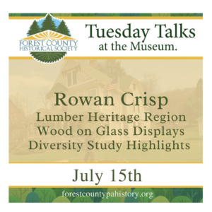 The Forest County Historical Society is thrilled to welcome Rowan Crisps from the Lumber Heritage Region. Her presentation encompasses Wood on Glass Displays and highlights stories from the Diversity Study. Speakers will talk from 7:00-7:30 and then stay around until 8:00 pm for any questions from the audience. This event is free for all museum members and costs $5.00 for non-members and includes a tour of the museum. We hope we have an interesting line-up for you this summer and you will come and join us.