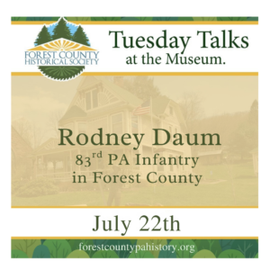 The Forest County Historical Society is proud to welcome Rodney Daum for a fascinating presentation on the Tionesta Civil War soldiers who served in the 83rd PA Infantry at Gettysburg. Speakers will talk from 7:00-7:30 and then stay around until 8:00 pm for any questions from the audience. This event is free for all museum members and costs $5.00 for non-members and includes a tour of the museum. We hope we have an interesting line-up for you this summer and you will come and join us.