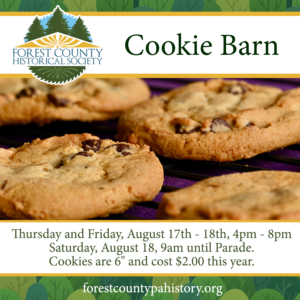 Cookie Barn - We will once again open our cookie barn on Thursday August 17 4-8:00, Friday August 18 4-8:00, and Saturday August 18 9:00 until parade. Cookies are 6" and will cost $2.00 this year.